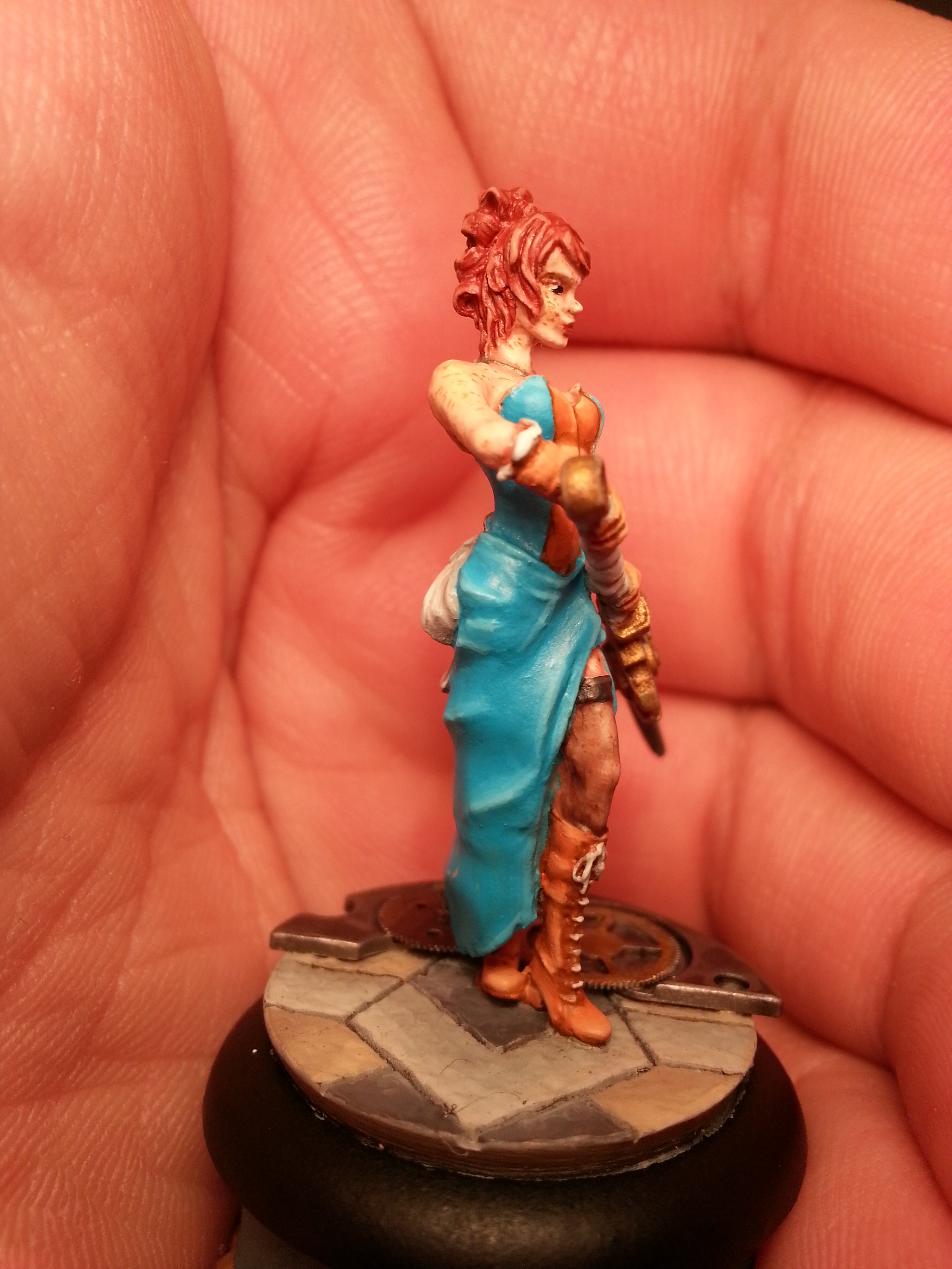 At first I was kind of worried how her dress would appear. Since it is so ‘flat’ as such, with little texture, it could come off as plain and boring. Instead of using a darker turquoise color, I went for a really bright version. One that would also definitely clash more with her hair. Adding some orange and white elements to it really made it look nice in my opinion. After painting the dress and looking at it often throughout the process, I can understand why some people add stripes or other designs to her dress. I am content with simple and blue. It does pop as well and that is what her dress is supposed to do.