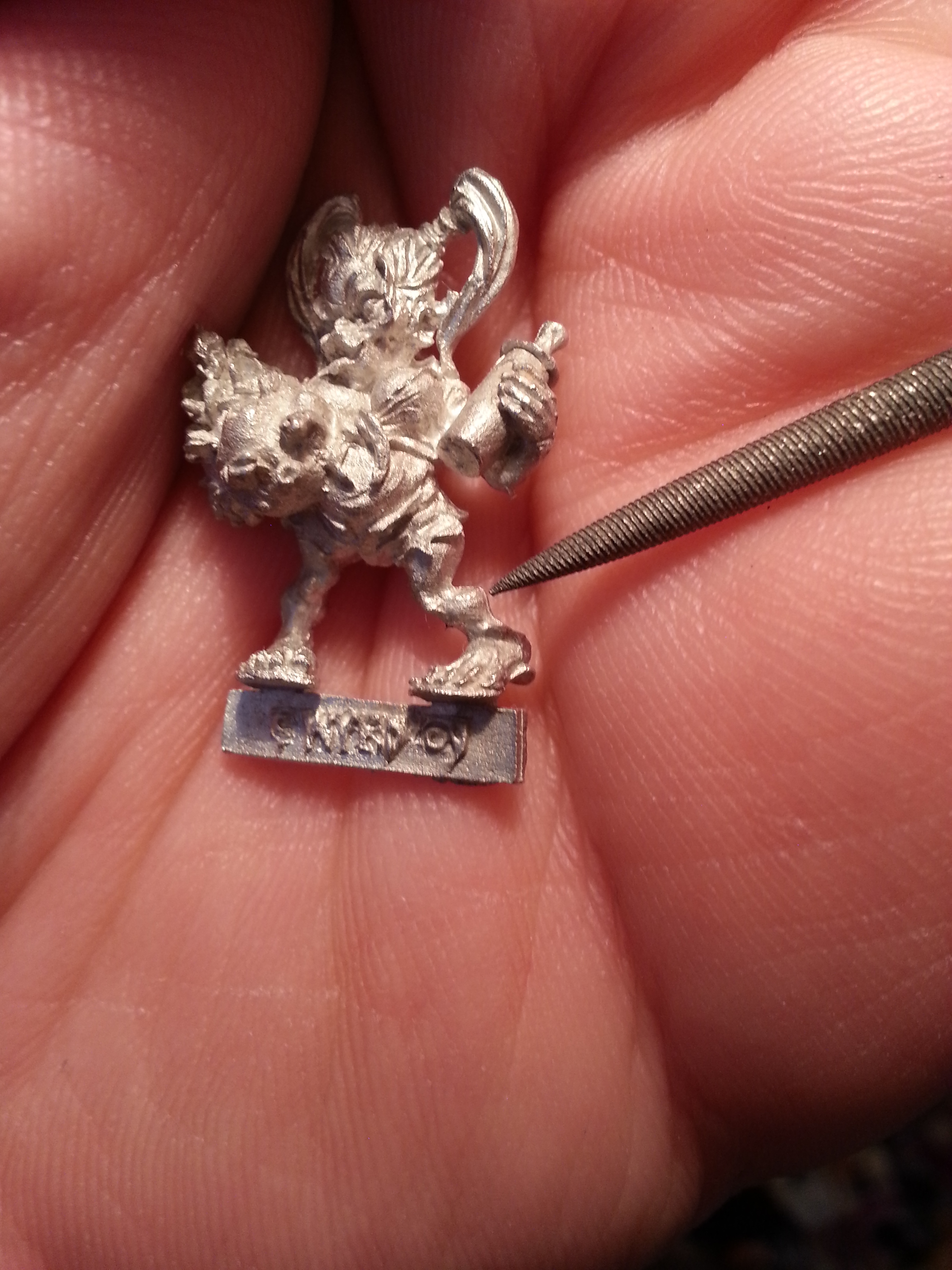 In this image and the one above it you can clearly see mold lines on the miniature. These happen when the model is being poured. Usually two blocks are stacked onto each other, where a mold of the miniature is imprinted on. Sometimes these plates are not 100% perfectly aligned or pressed together and thus you may get some small mold lines, as seen on the legs especially on this model. This needs to be removed, otherwise you may have some really yucky looking lines running down your model that is all nice and painted up. Just use some files and file them gently away. Feel free to use different forms of files, in order to get into small and tight recesses or to prevent from detail loss in other areas. You can pick up files like this in many hobby stores or miniatures and local game stores.