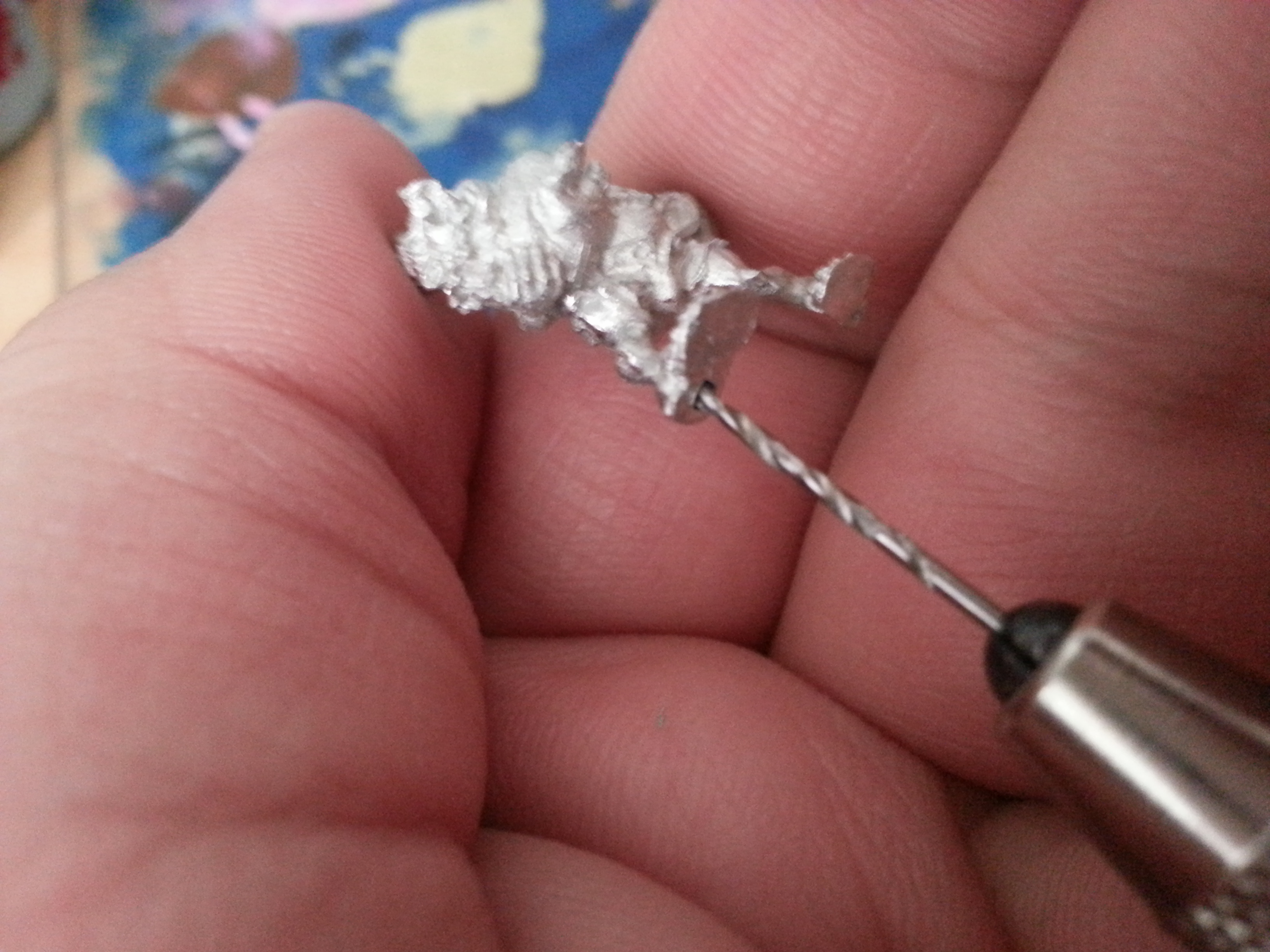 The next step is not really necessary on such a small scaled model, but I like to do it anyway. Pinning models to bases and also pining parts of models onto themselves to enable a more stable and securely glued model is a really good thing to pick up. Imagine your model topples over on the table and an arm, a head or even the entire miniature breaks off. You can prevent this a whole lot better by pinning the model. This gives more surface for the glue to harden on and thus keep it stuck to parts better than before. Often some minis will have little nobs that are basically there to function as little pins. It may suffice for you, it may not. I recommend pinning. What I do is drill a small hole in the area where I want the pin to go into. In this case I am going to pin the model (only one foot) to the base to help secure it on the cork plate I plan to have it stand on. Drill ever so gently, as you do not want to drill too far and poke out of an unwanted part of the model. Try to pick thicker areas where you can drill about 2-3 mm.