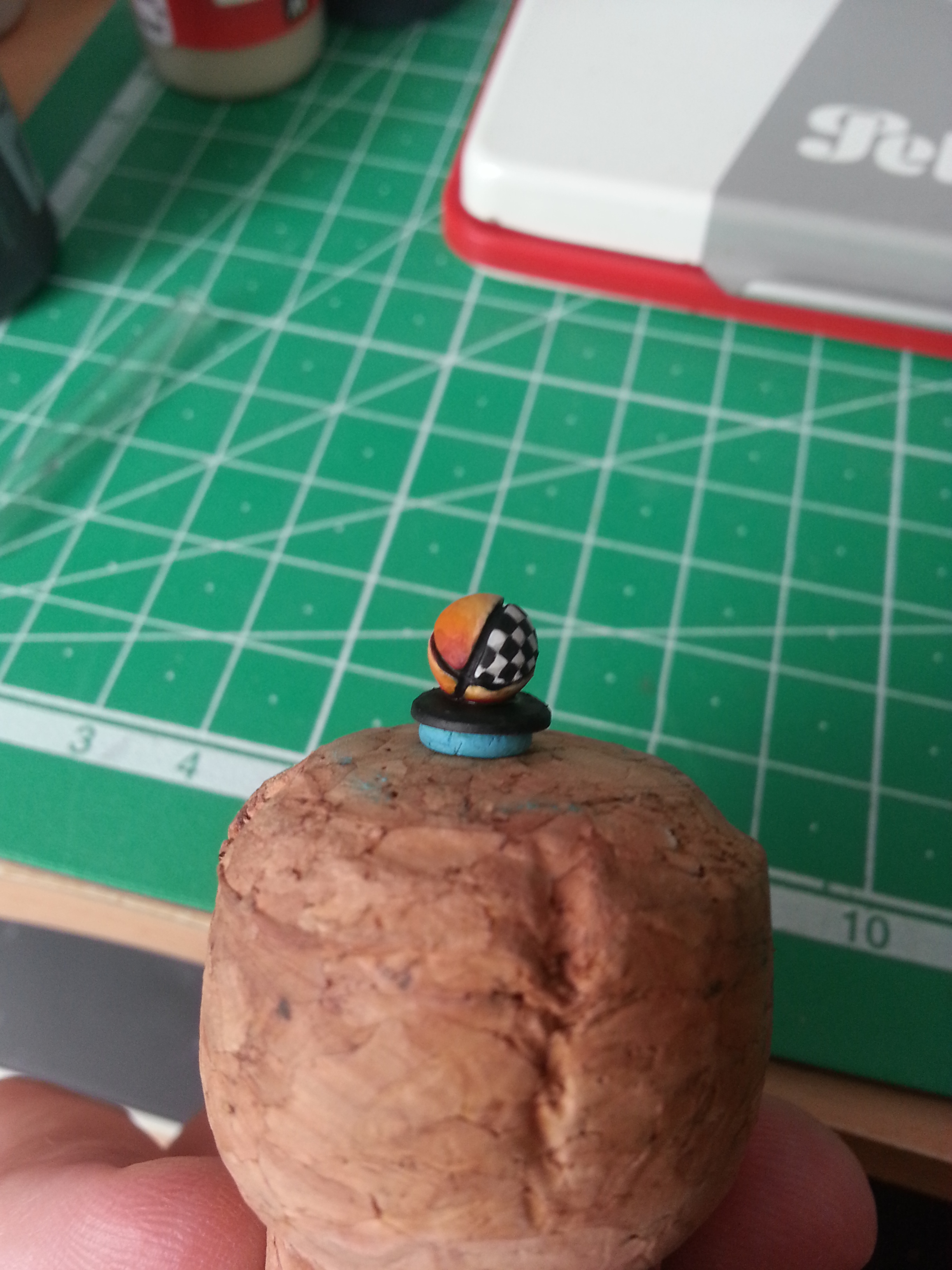 Orcs are usually depicted with green skin. So I already have one of the two colors covered! The remaining would be orange and I basically have the sporting gear left to paint… Easy decision there as well. To be fair, though, the orange gear was kind of set in stone, after I have seen a really well painted orange orc and goblin team by another person. I went far enough to steal his/her idea on using some checker designs in it as well. Some things I did not like and I will be altering the scheme more to my tastes. Another color I would like to include would be purple. It will be a secondary color for some gear and especially mostly glowing effects on the models, such as lighted up player numbers and the likes. To kind of get an idea on what the gear will look like, check out this ball I have painted up in the team colors.