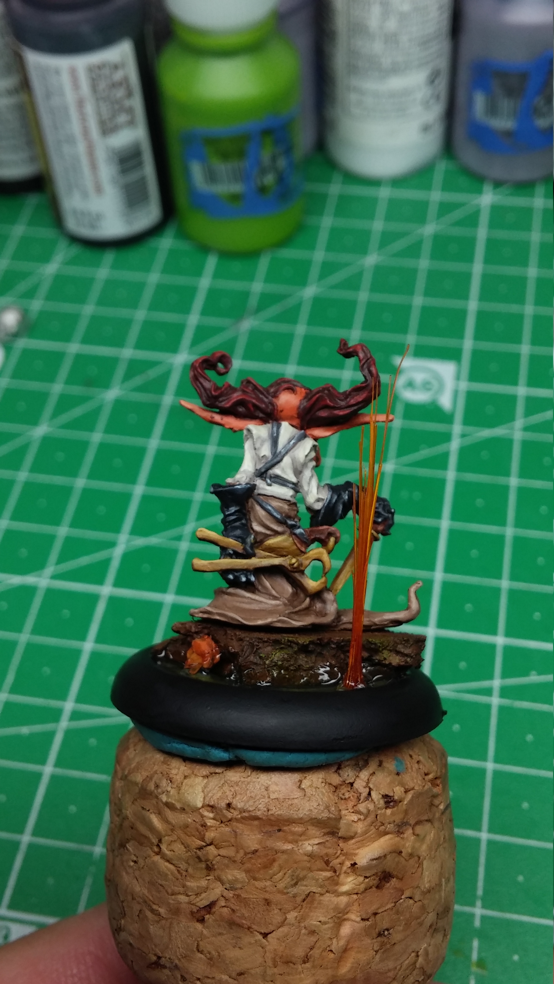 The next three models are some wacky fellows to add to my Gremlin lists. The first is a Taxidermist. This guy can make undead pigs with explosives. Crazy! I was unsure about what to do with his hair. A pure grey would have been too in tune with my color scheme. I also thought of a bright and fiery red tone for some additional craziness. I ended up going for a dark red. After I painted the hair (first things I did after the skin tone) I was really unsure about it. I couldn’t really see it all blend well with the rest of the color scheme I had in mine. I decided to paint it all first and then see how I liked it. Turns out I was pleased with it in the end. This just tells you to not give up on an idea immediately.