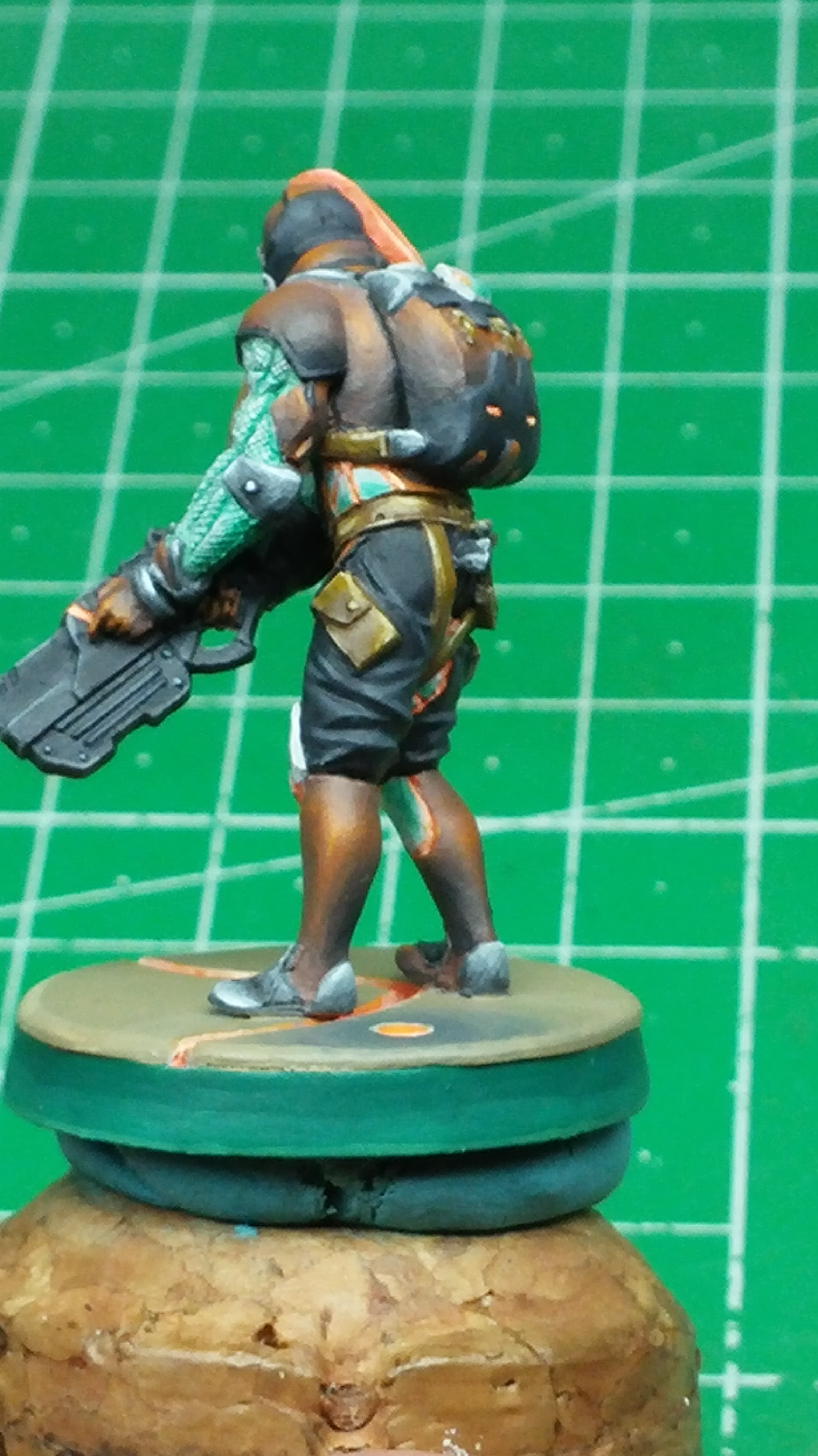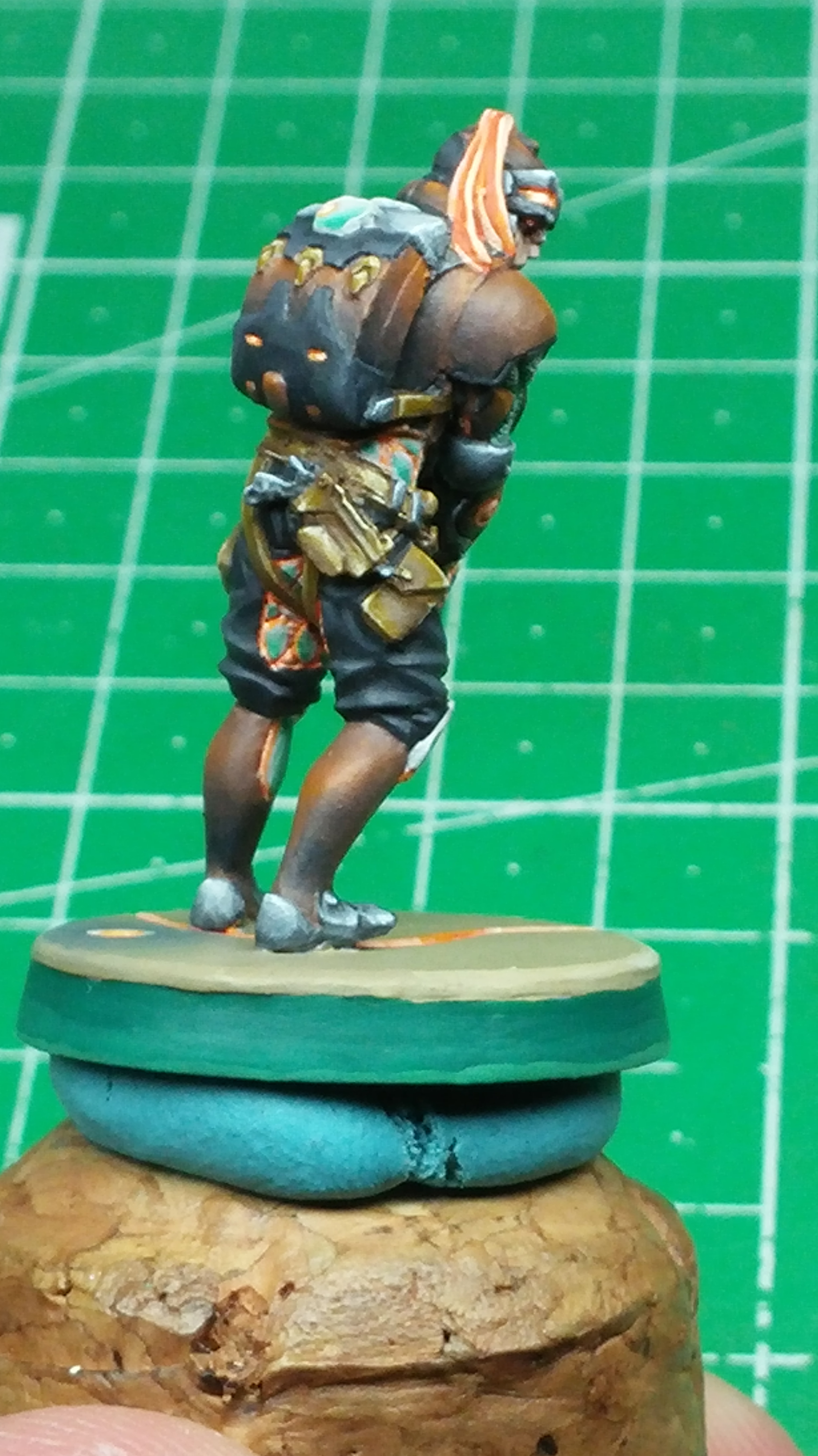 My big problem was how to include the accessories to the model without making them contrast too starkly from the model and yet fit in well. Using a brown base is generally a good idea, since I do so on the model. But going into a generic brighter brown tone would be too dull. So instead I added a golden-yellow color and got some noticeable yet fitting belts and pouches.