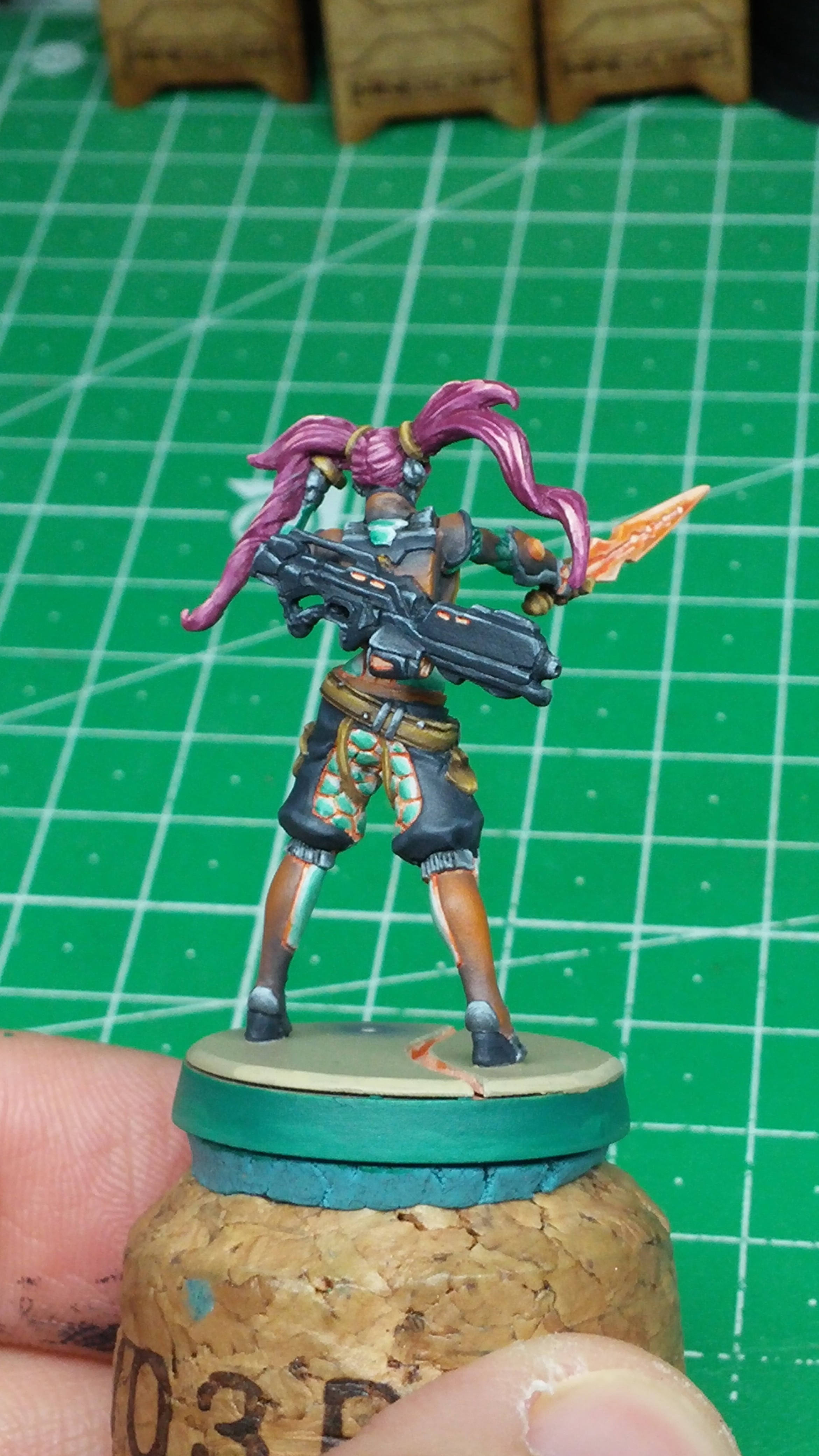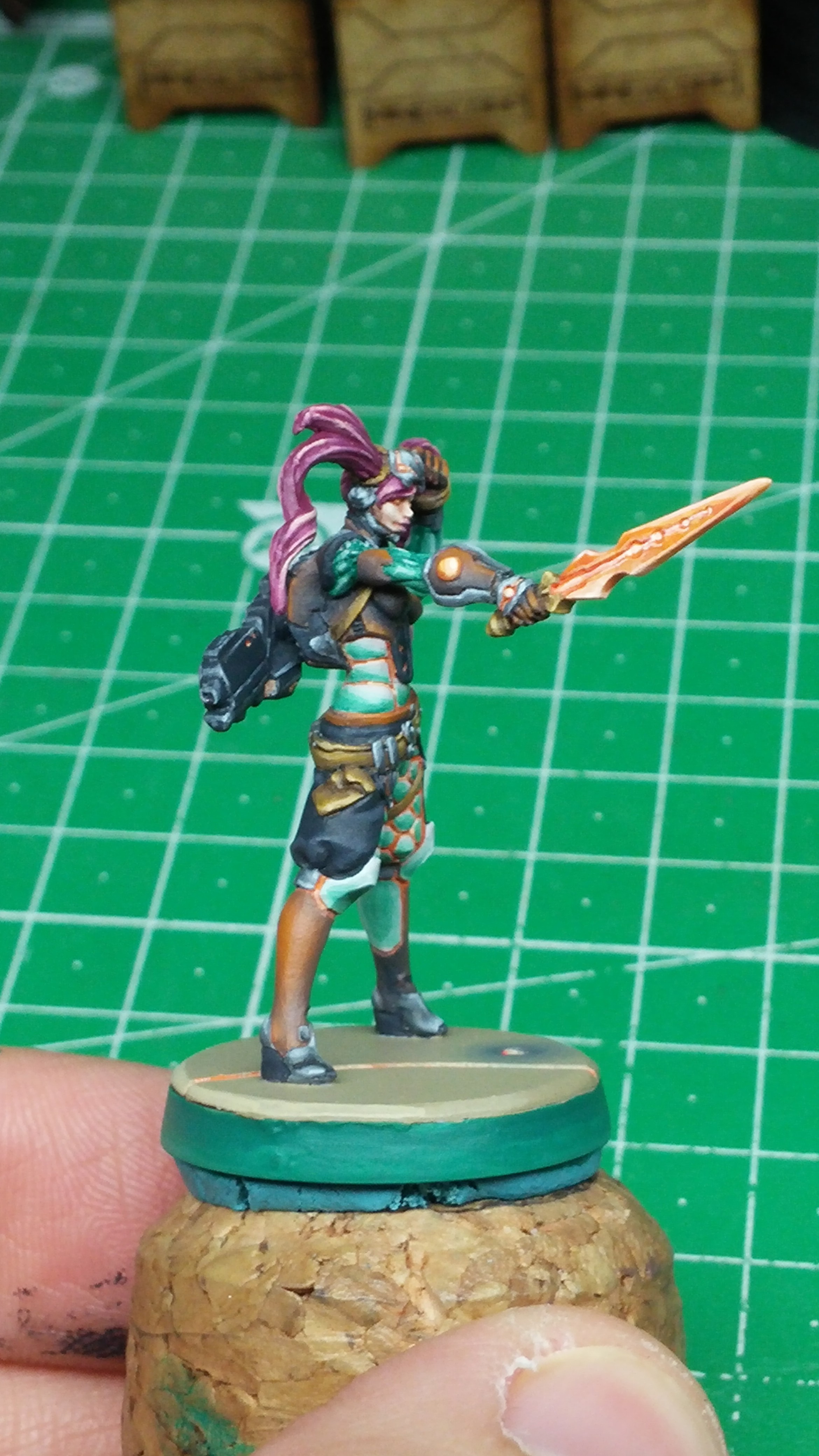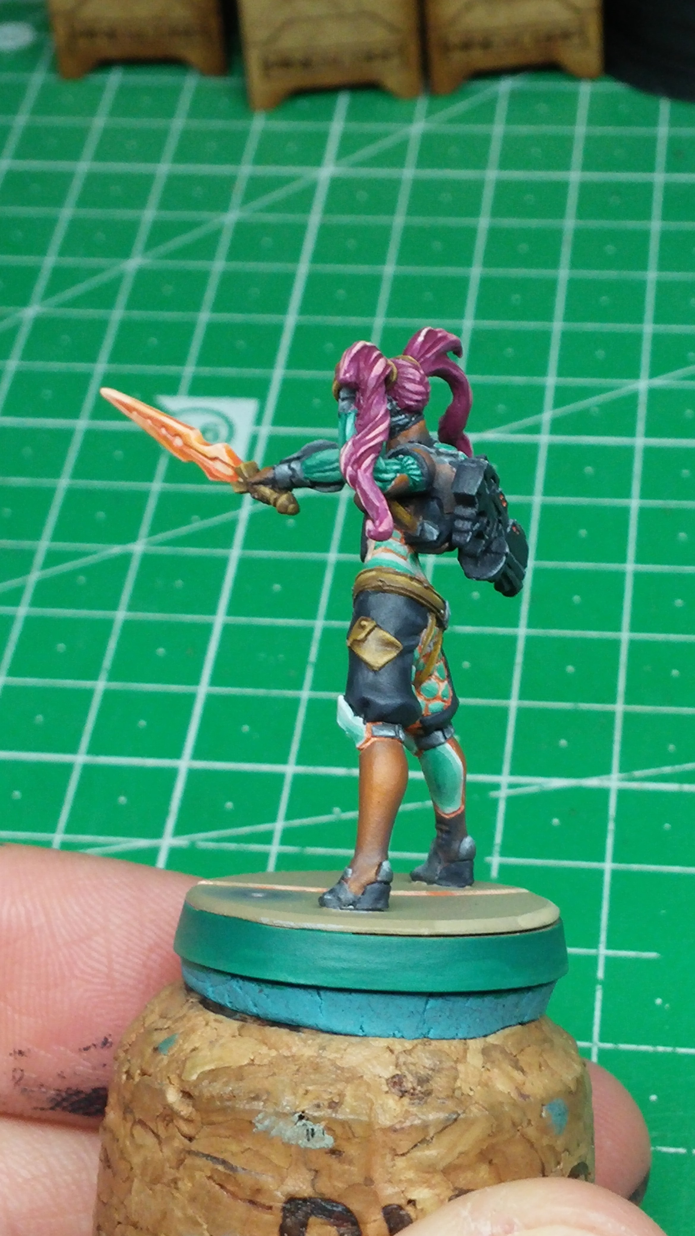 Nesaie Alke. One of my all time favorite Infinity models. It was a treat to paint her and I am super glad she turned out so lovely. The purple/pink hair was an experiment, using orange and yellow tones to highlight. Her pose is very fitting as she is pretty much the perfect Leader or even lieutenant to use in-game. Like Thrasymedes she differs slightly from the regular Thorakitai in some minor details. Over all though, she fits in perfectly well and helps toss out a great uniform look to the squad I have painted.
