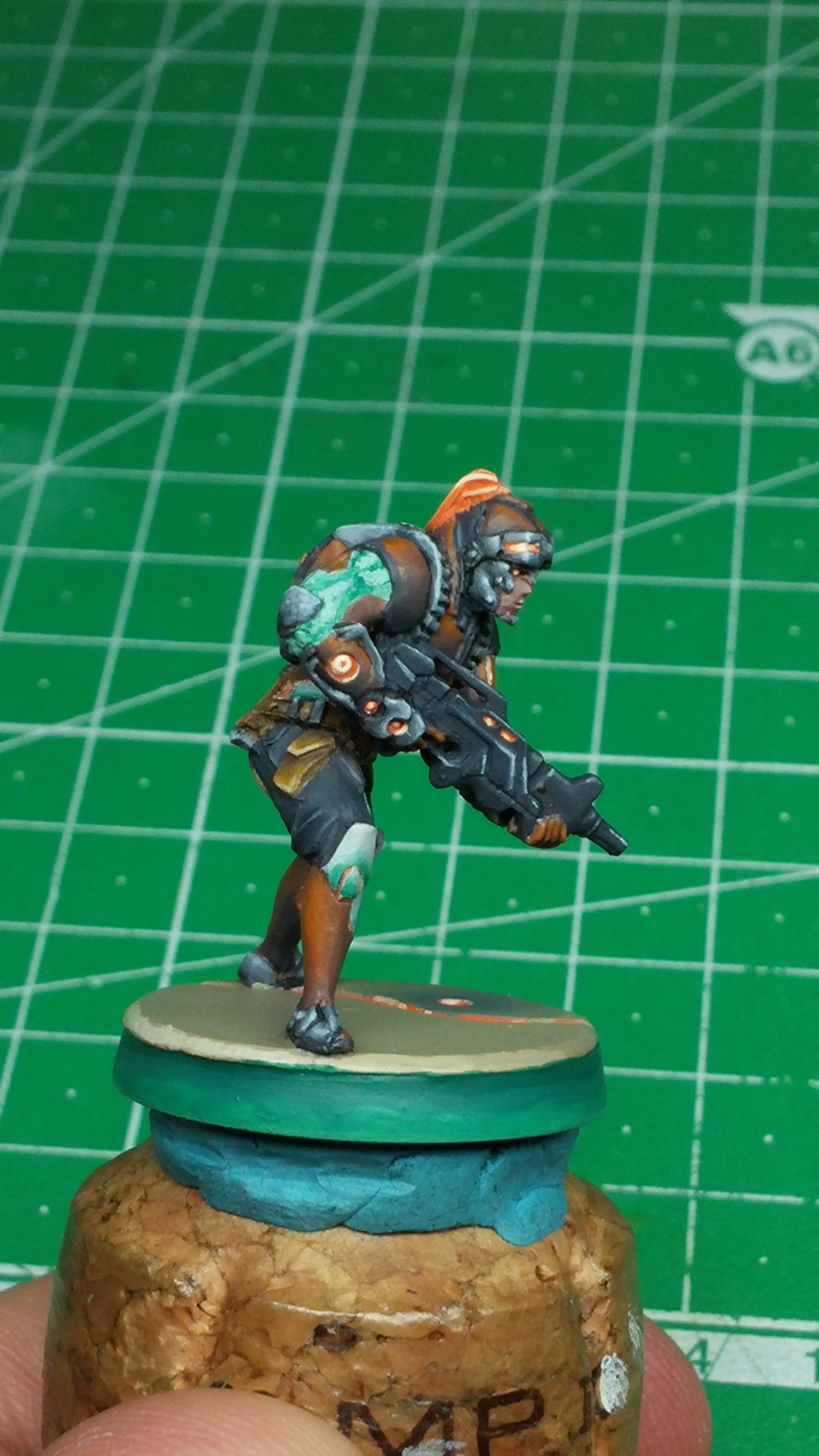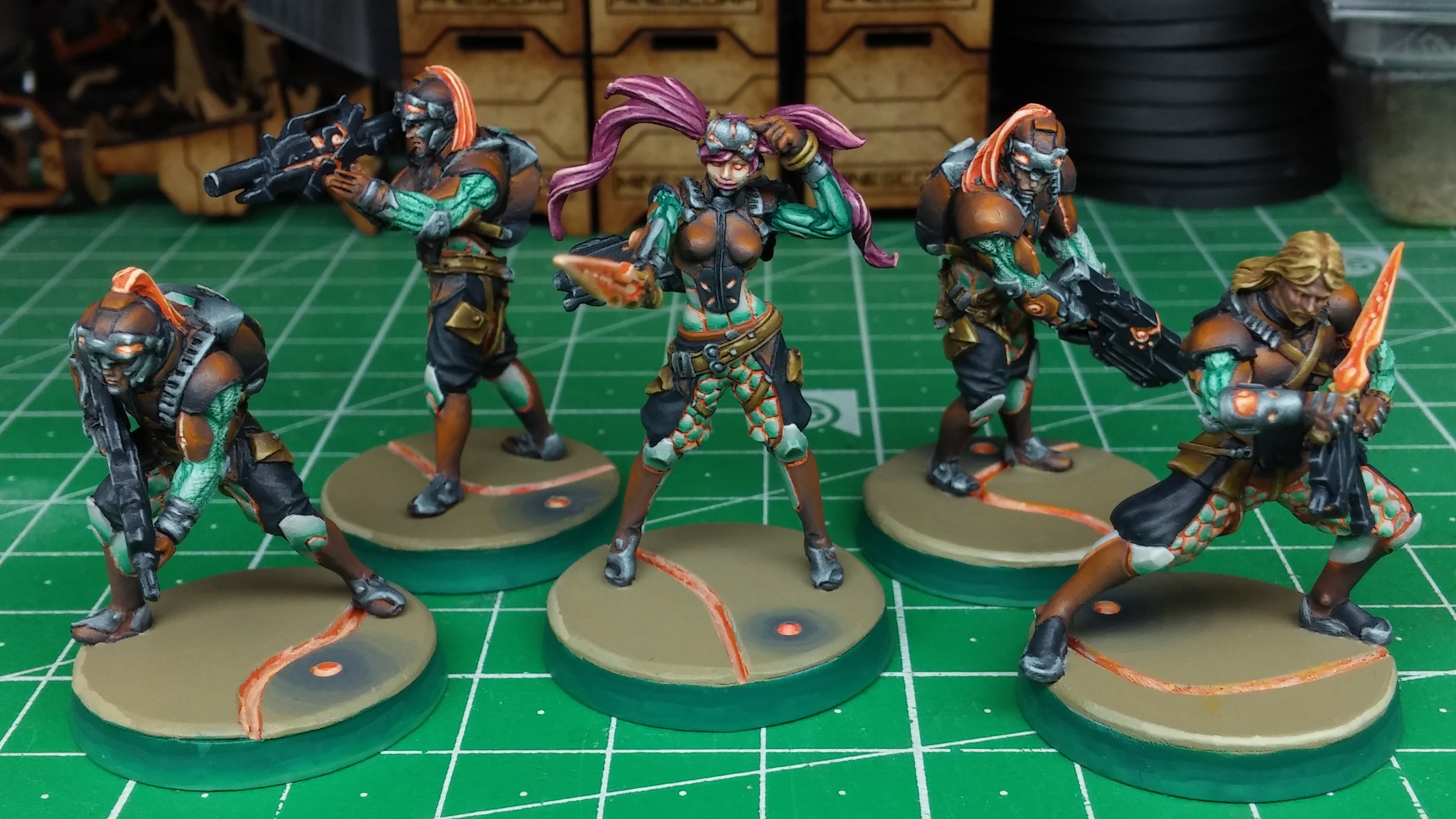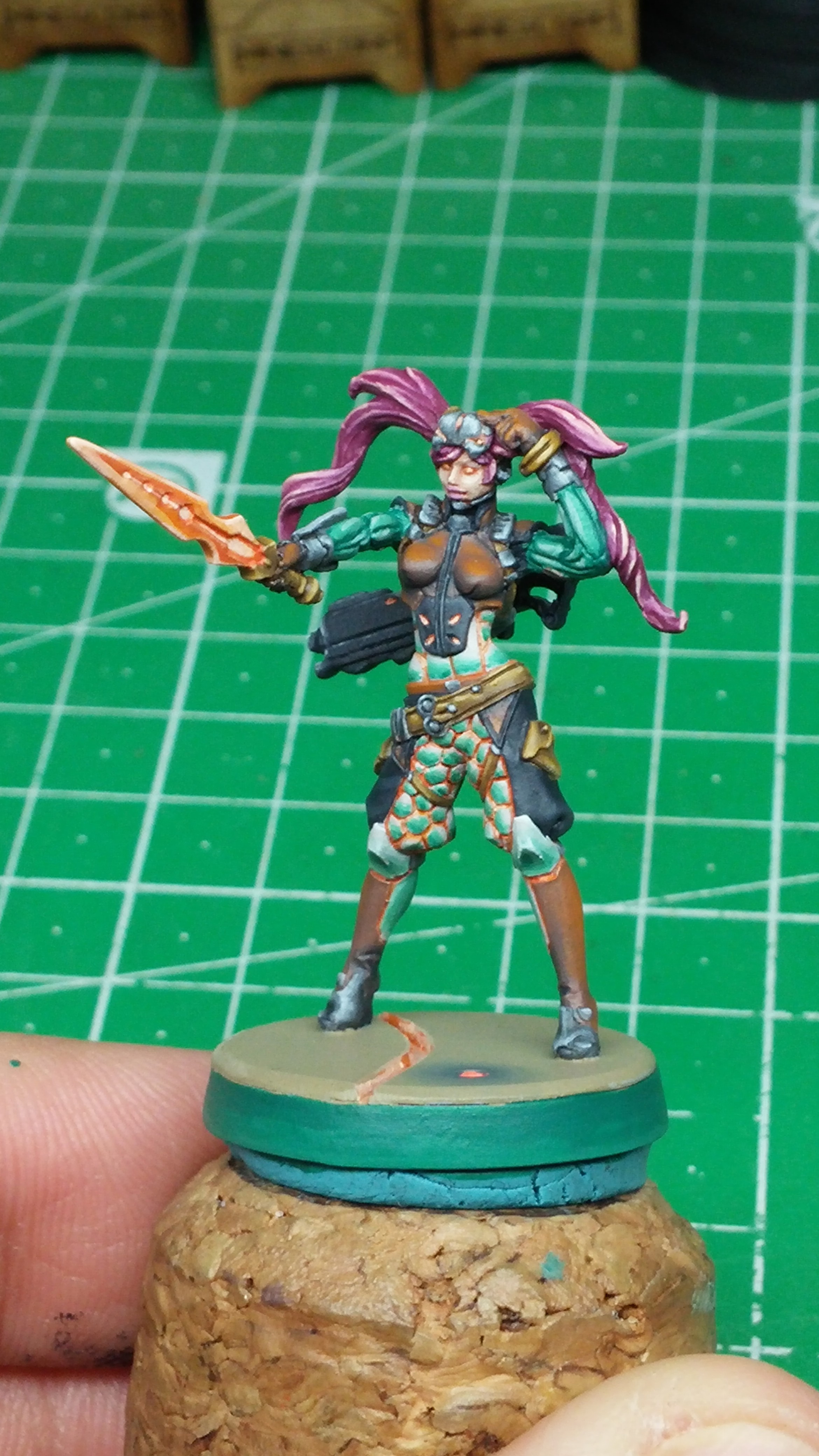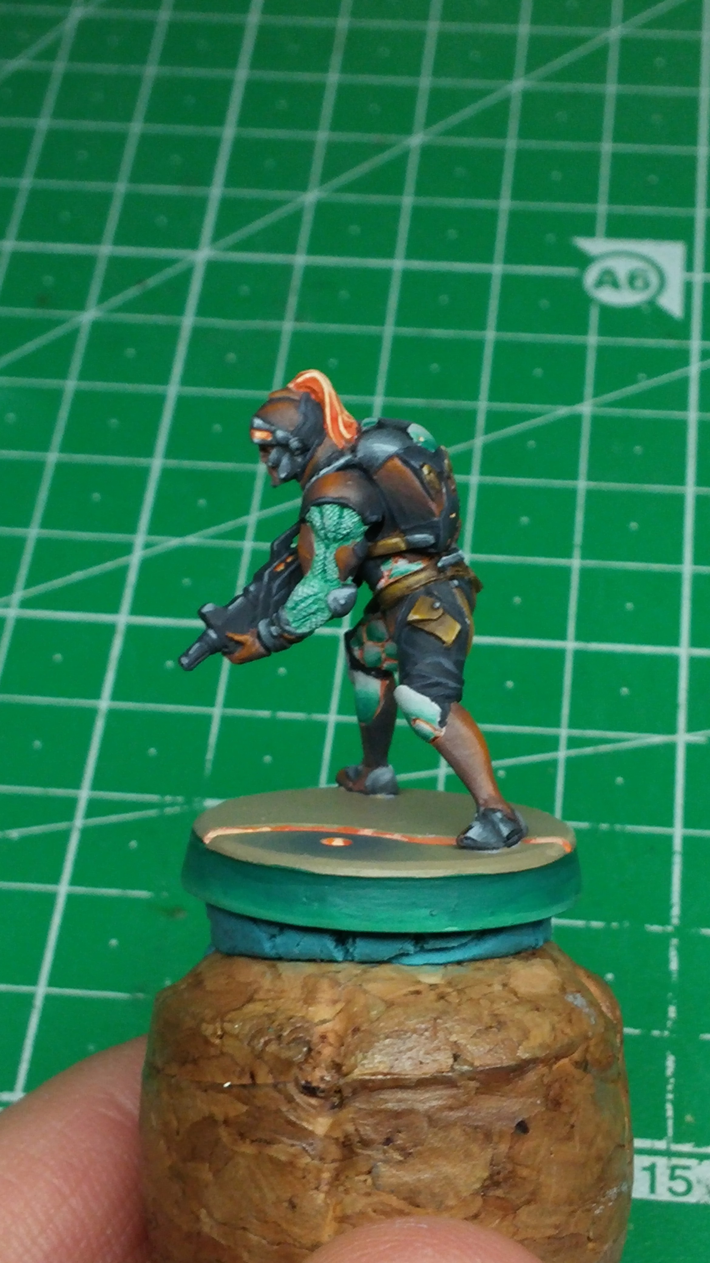 Nesaie Alke. One of my all time favorite Infinity models. It was a treat to paint her and I am super glad she turned out so lovely. The purple/pink hair was an experiment, using orange and yellow tones to highlight. Her pose is very fitting as she is pretty much the perfect Leader or even lieutenant to use in-game. Like Thrasymedes she differs slightly from the regular Thorakitai in some minor details. Over all though, she fits in perfectly well and helps toss out a great uniform look to the squad I have painted.