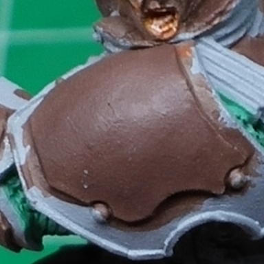 Using Gorthor Brown in its pure form I start working my way back to the original tone, basically covering hard transitions of the colors and softening them up. As mentioned above, make sure your paint is thin enough to not necessarily cover the area on the first try. Two to three layers is well enough. Feathering works too, if your paint isn’t thin enough. This tends to be a bit more difficult for some. With this section we have finished the shading section of these areas. Now it is time to work towards the brighter side.
