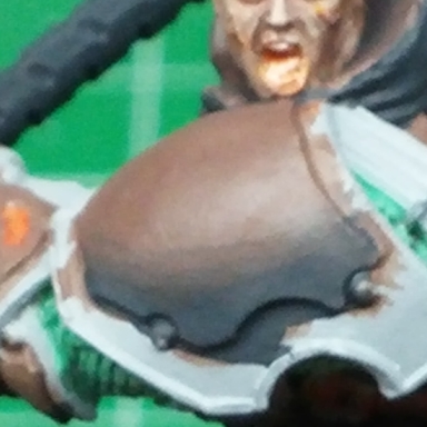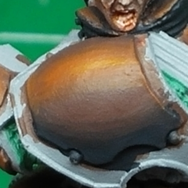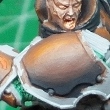 The final steps are more just cleaning up some of the minor mistakes you have had and applying Orange Brown to the brighter areas for more stronger color. I add a slight highlight with a 1:1 mix of Orange Brown and Scrofulous Brown to make it look like the light is hitting a high spot. Or to edge highlight some of the portions for good measure.