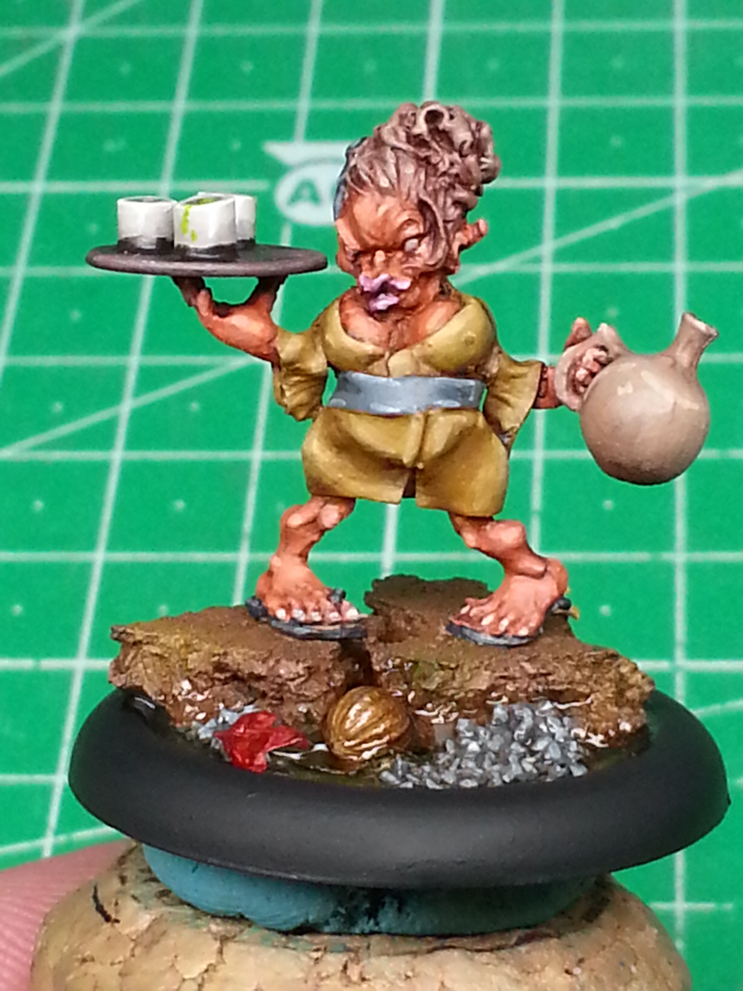 This gal is one I kind of made myself. I used a Gremlinette as a base model, took off a bit and added some more to make a cute serving girl for my Brewmaster. She functions as either an Oiran (TT) or Performer (TT/GR). Her dress was made out of green stuff I had flattened and cut to size. Nice mini skirt! Her platter is a bit of plasticard and the cups are some cut up plastic cable. Simple and easy to manage with regular stuff I have lying around. I am kind of proud of her. I surely could have done better. I am still content with her being one of my first attempts at sculpting/modifying an already finished model.
