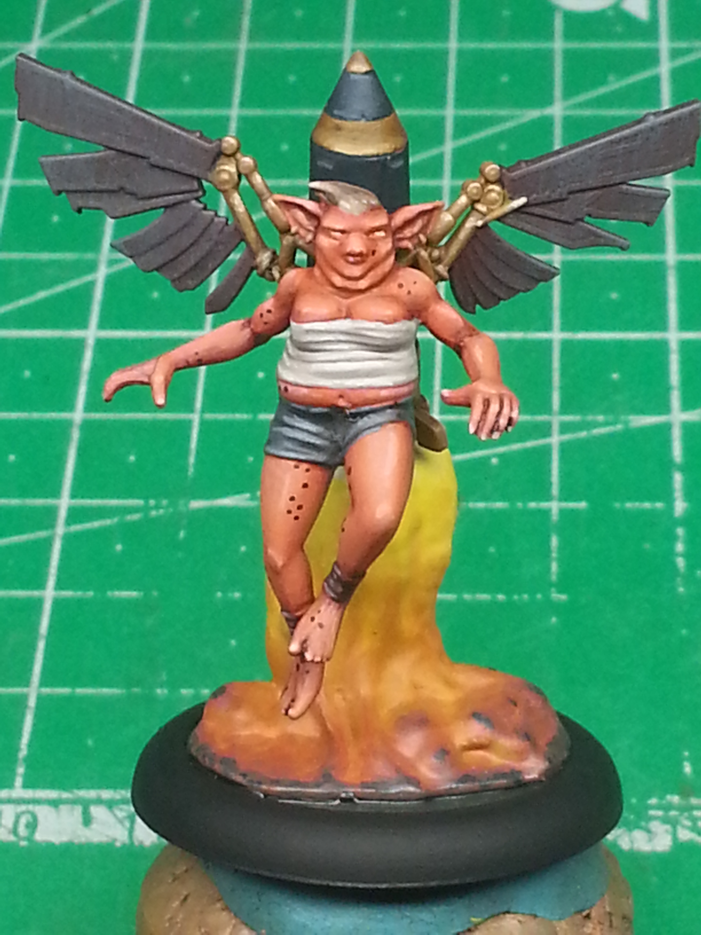 A model I forgot to add to my post with Mah Tucket, Little Lass and my Rooster Rider would be Merris LaCroix. The big fat and angry jet pack gremlin of super hot death and doom… stuffs. She was a blast (pun intended) to paint and I am really glad with the results. Her rocket pack is kind of half-assed, but I can live with that. Most of her attention is drawn towards the pillar of smoke and flame she emits and I must say I really dig what I did there. I will have to use that set of paints again in the near future (Wong crew…).