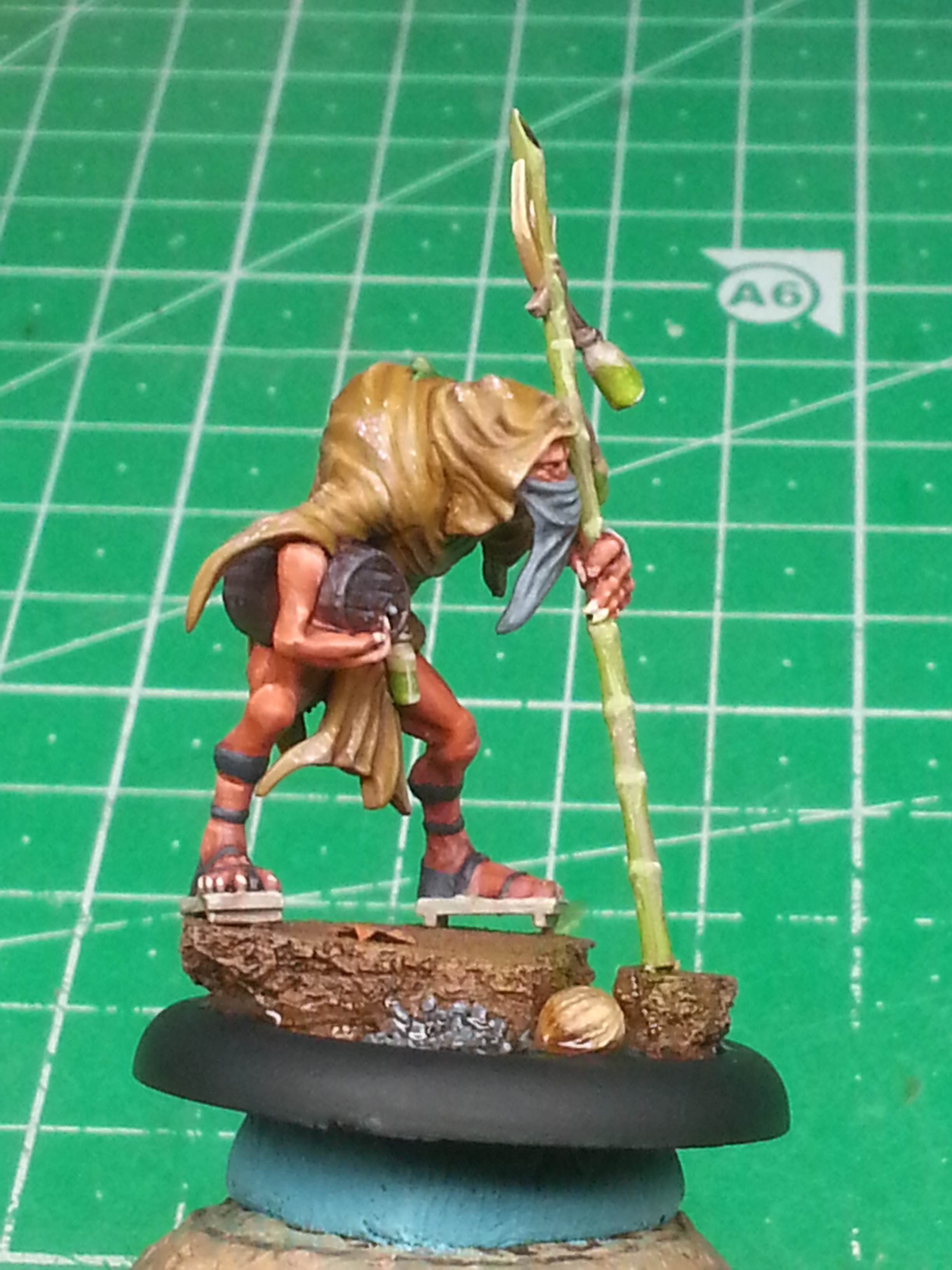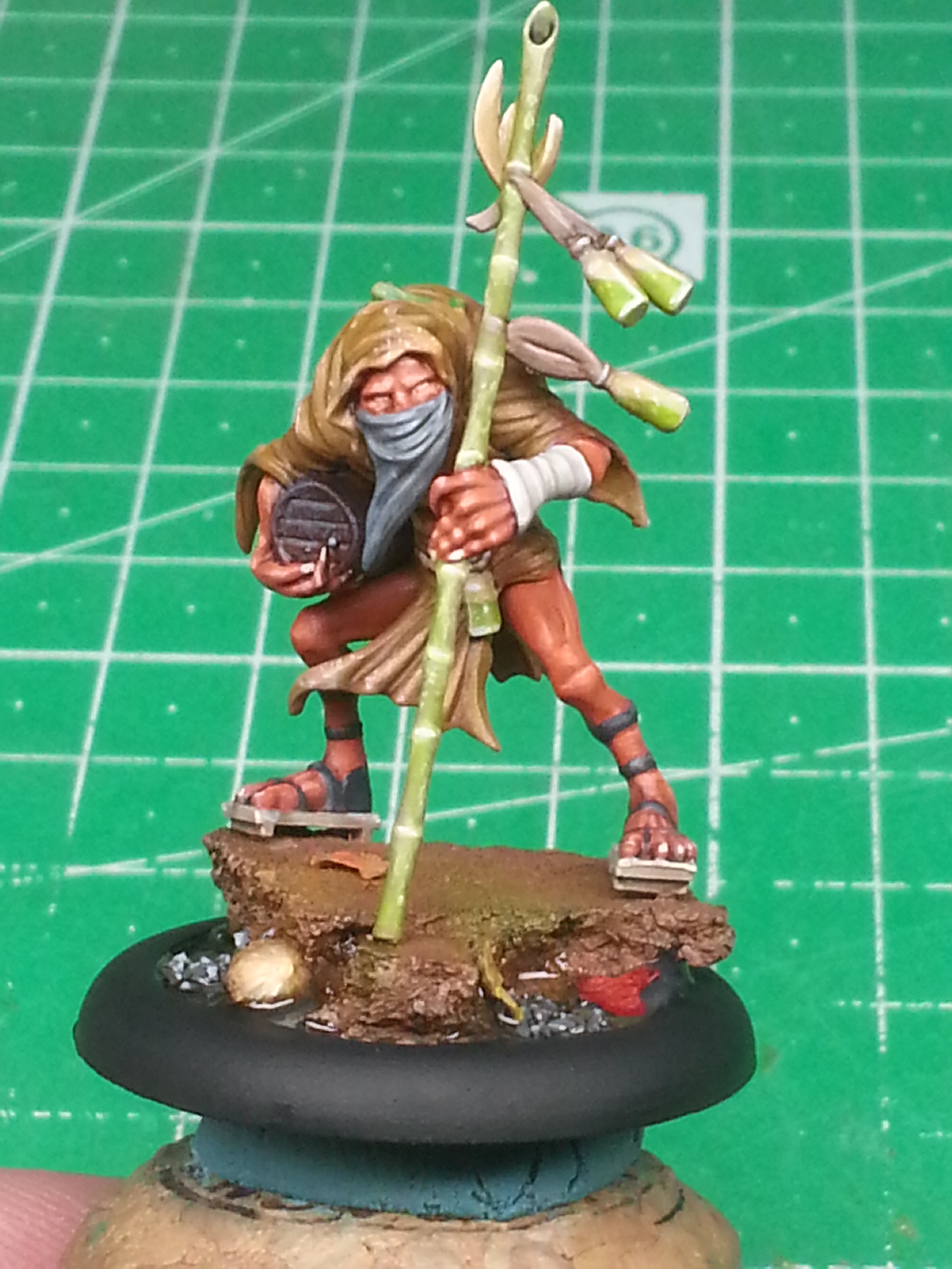 His cane is technically bamboo. Most bamboo sticks you would see are going to mostly be a light brown/ocher tone. I couldn’t paint that due his cloak already being a similar color scheme. So I went for younger and fresher bamboo, in green. A great way for me to add another green color to my model pool. I like the way it turned out, as it could almost be real… Haha. Just joking. A fun model to paint and I am glad I have him finished.