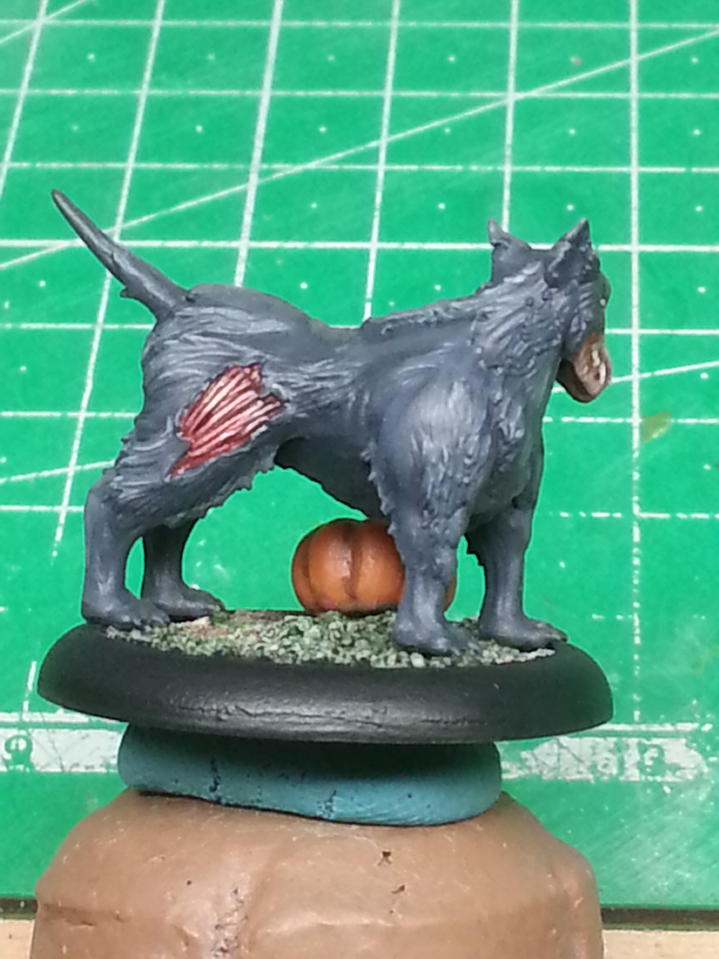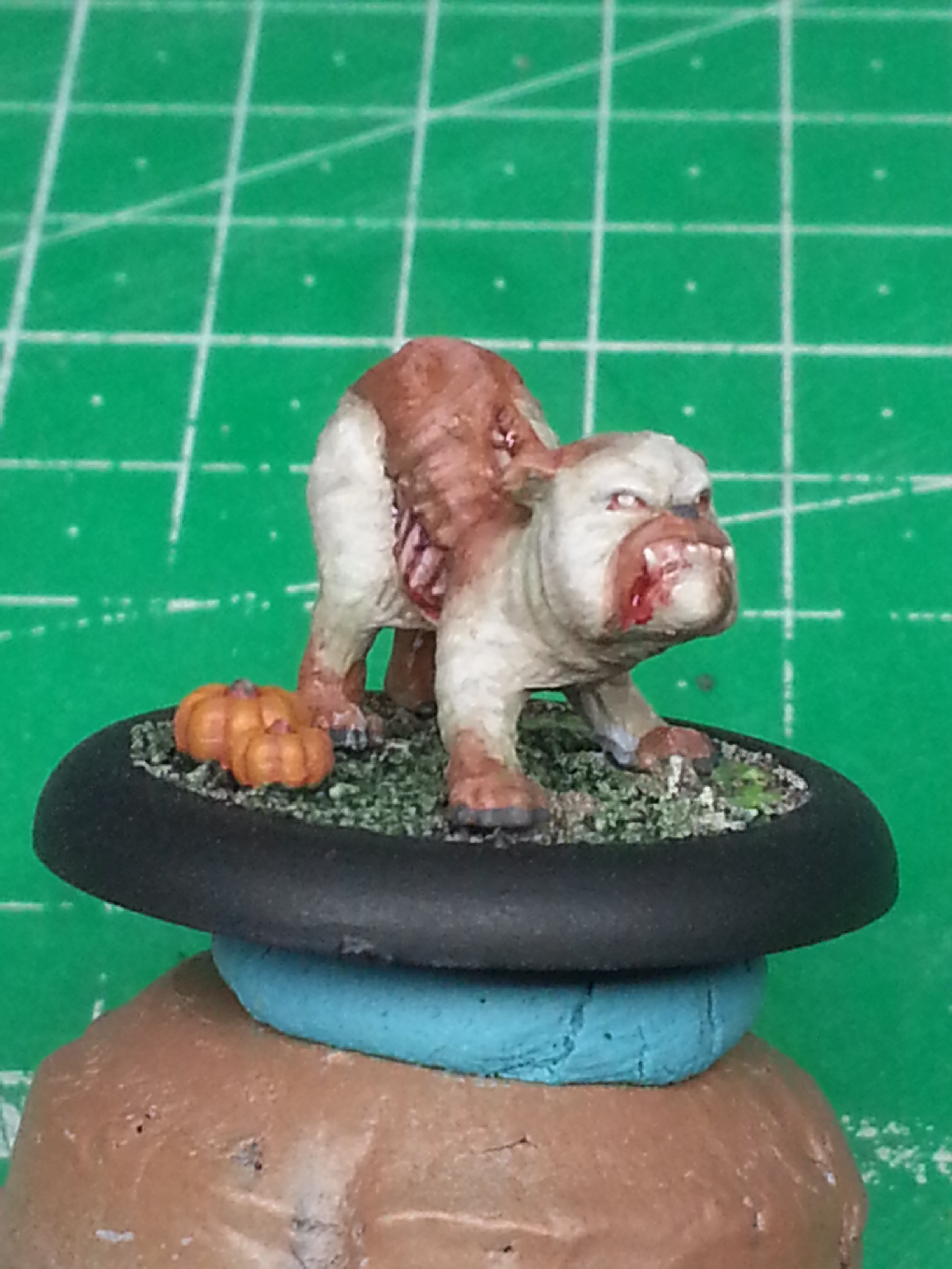 This big guy was the first of the four (five technically…) Canine Remains I have painted. I dig this model the most of the four zombie dog models, as it just shows the most character. A snarling critter with exposed ribs and innards. HOW ADORABLE! I figured a white color with some brown spots would look good on him. Turns out it doesn’t look too shabby.