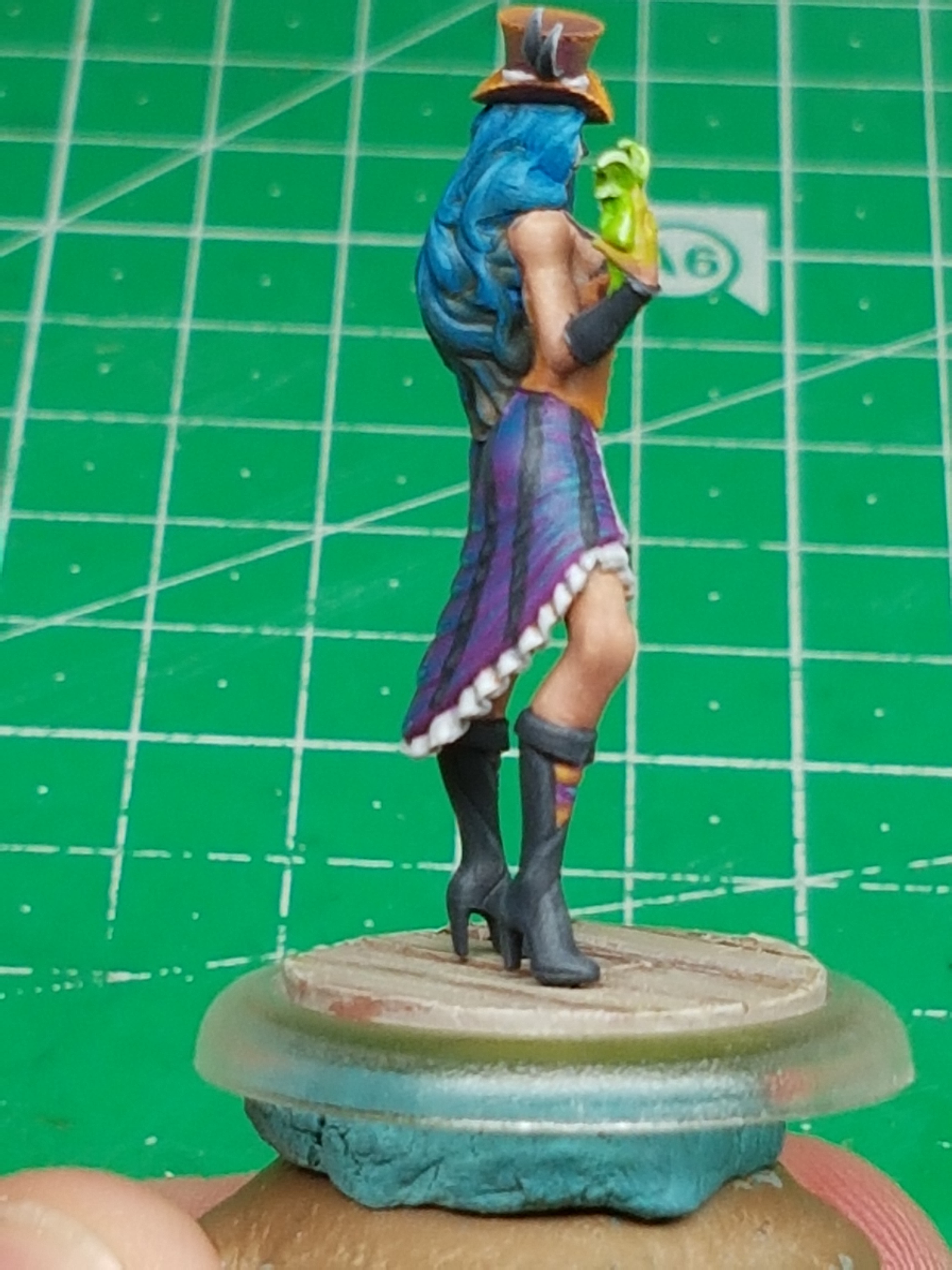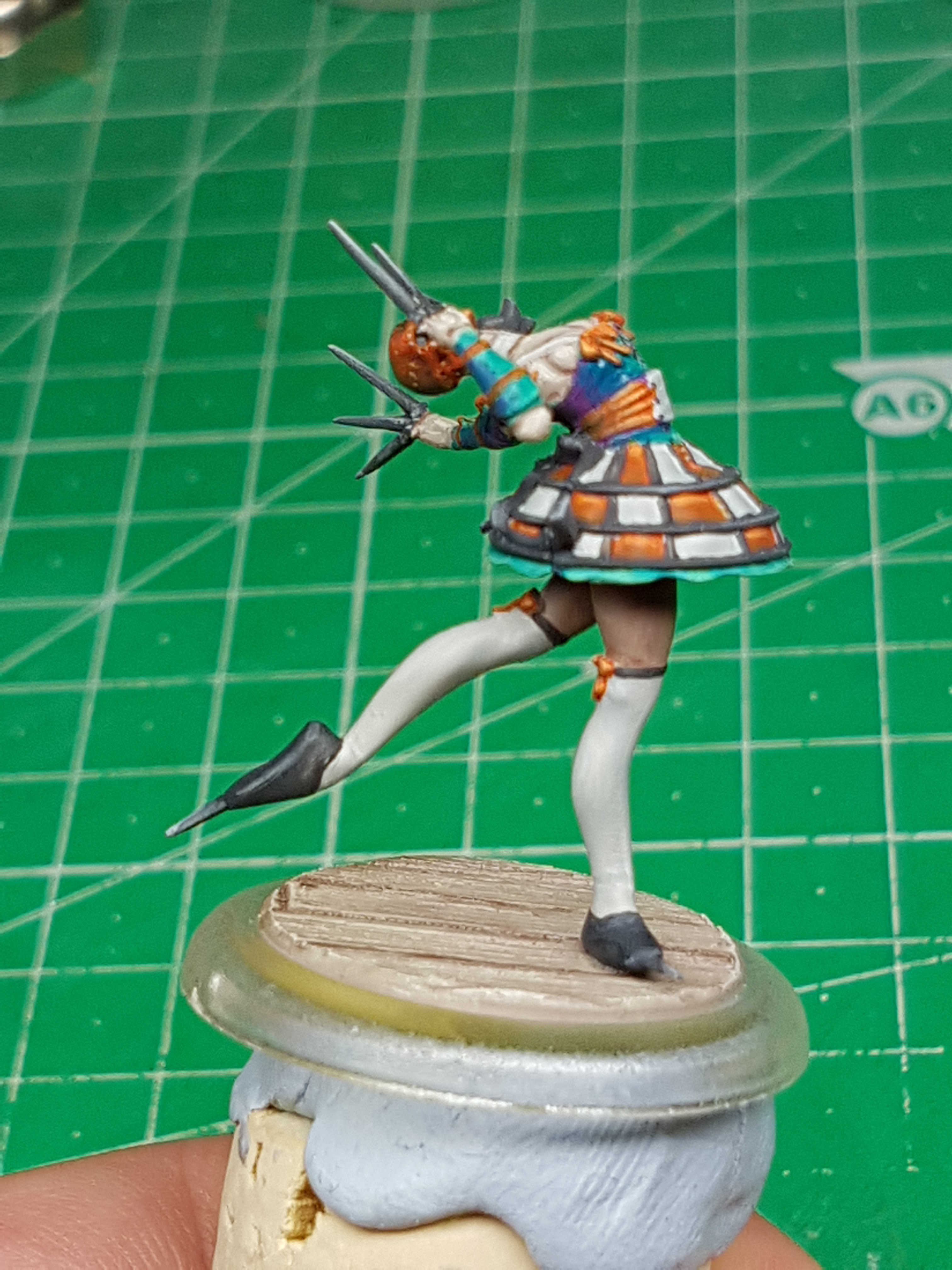 All of my showgirl models have a uniform set of colors and the teal/purple combo had to go more purple than teal. Reasons to this were to compliment the purple shading of the orange bits a bit better and because her hair is blue/brown and having too much blue would have been overkill. I wasn’t too pleased with how her skirt turned out so I added some black stripes, which turned out to be a really good choice. I like the look and feel of the skirt a whole lot better now. Its dark and still colorful enough to lend plenty of contrasts to the rest of the model.
