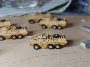 The tanks are snazzy little things with green windows! This scale isn’t too easy to paint and unfortunately most of the detail gets lost once you see the minis on the table. Still a good chunk of work done!