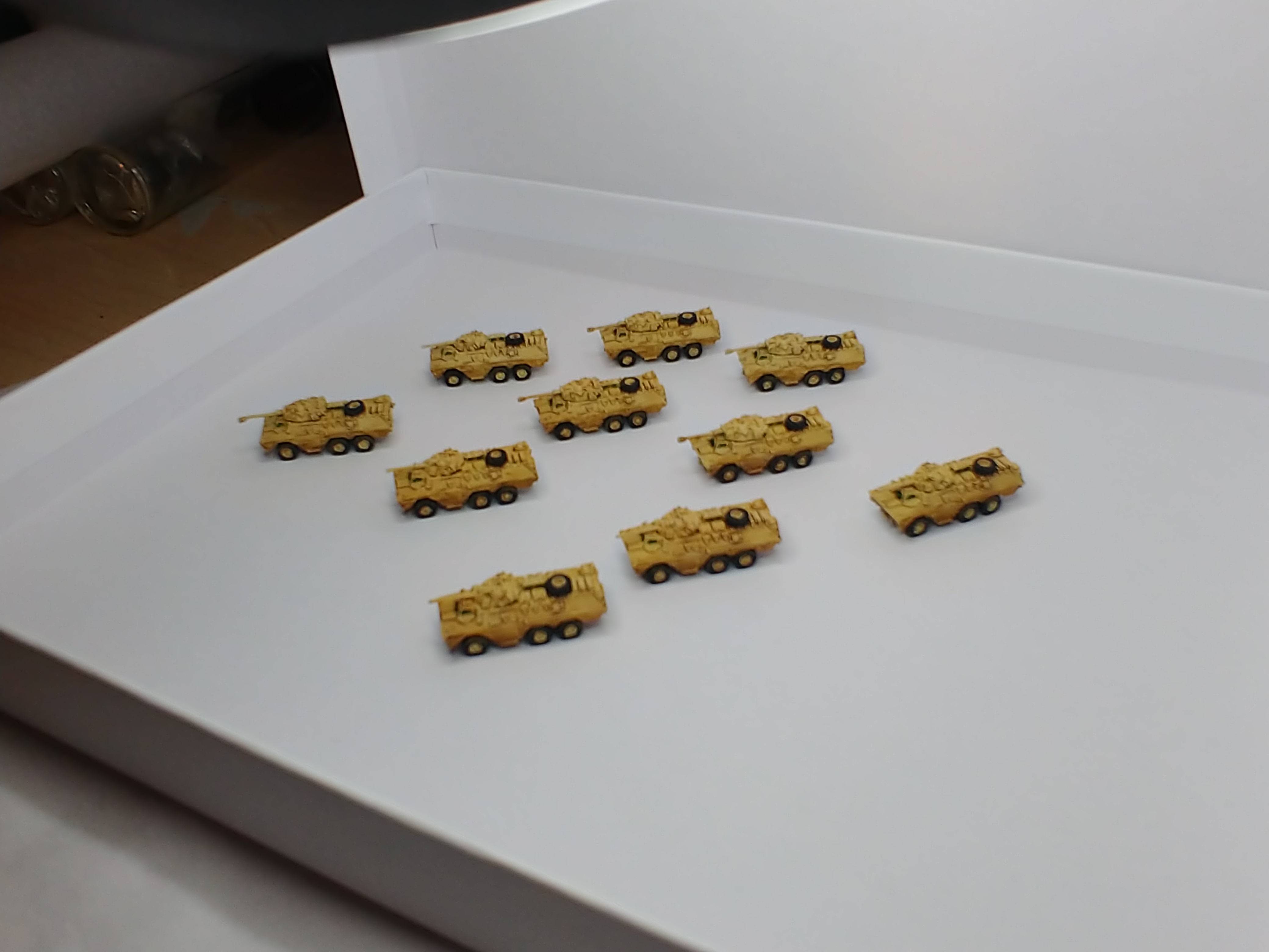 The tanks are snazzy little things with green windows! This scale isn’t too easy to paint and unfortunately most of the detail gets lost once you see the minis on the table. Still a good chunk of work done!