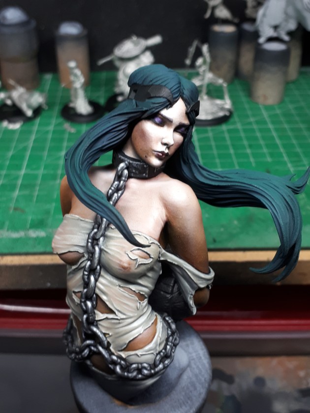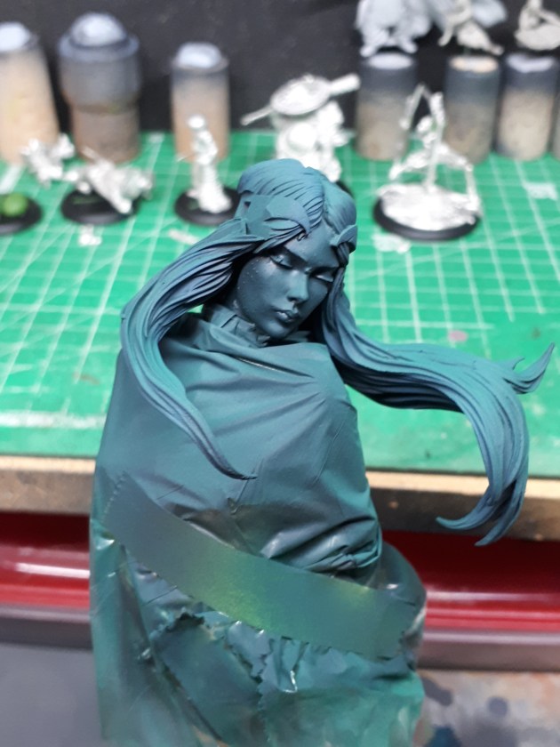 I have also been working a bit on this bust. Decided to do her hair with an airbrush and try out different forms of masking. I had some hiccups on the way, but it mostly went just as well as I had hoped.